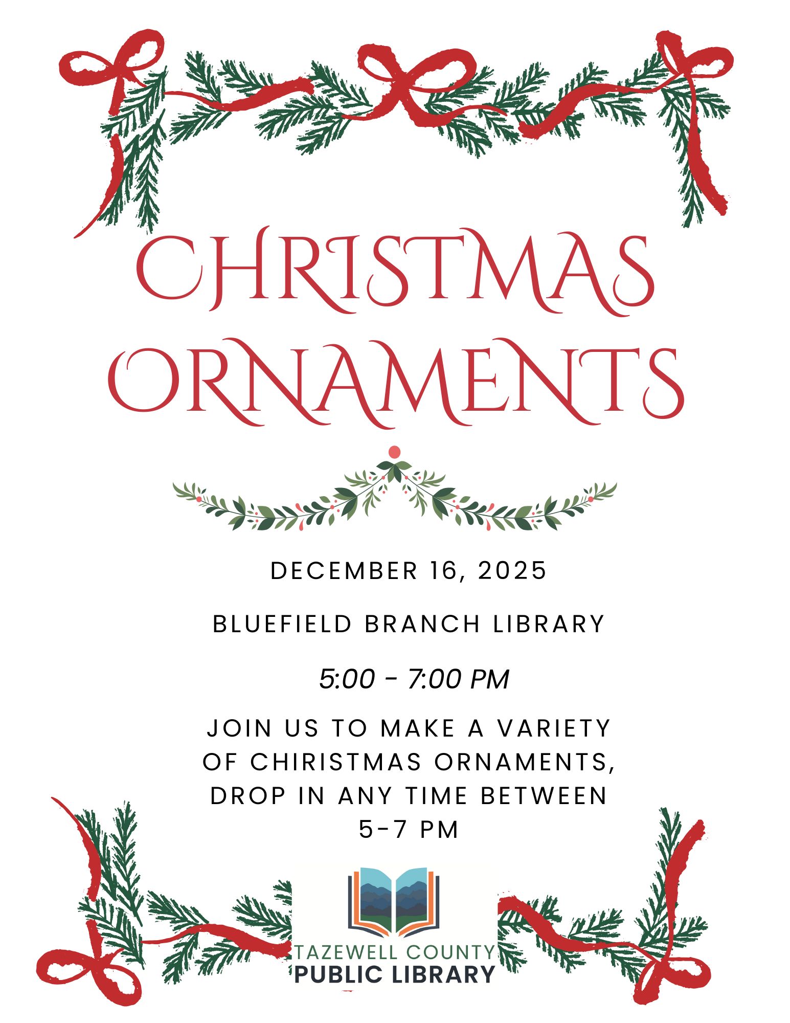 Drop in at Bluefield Branch Library and make an ornament or two or three! This is a free family event for all ages.