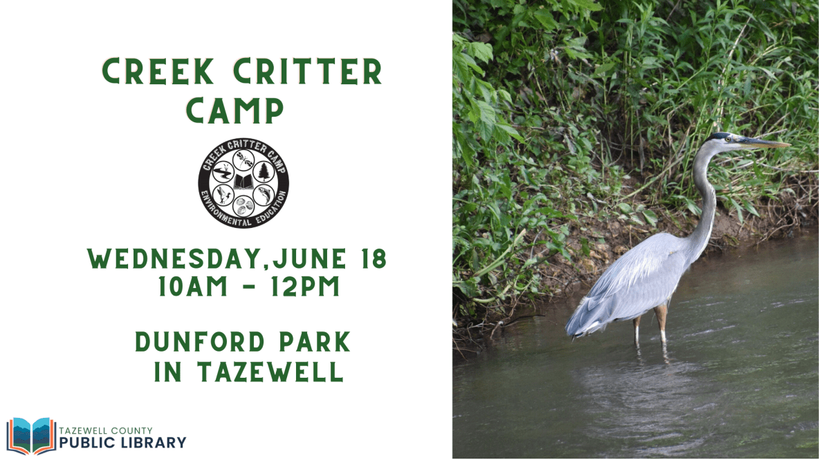 Join the library at Creek Critter Camp at Dunford Park in Tazewell. Experience a morning of activities, crafts, stories and more. In partnership with the Tazewell Soil and Water Conservation District. This is a free event for all ages.